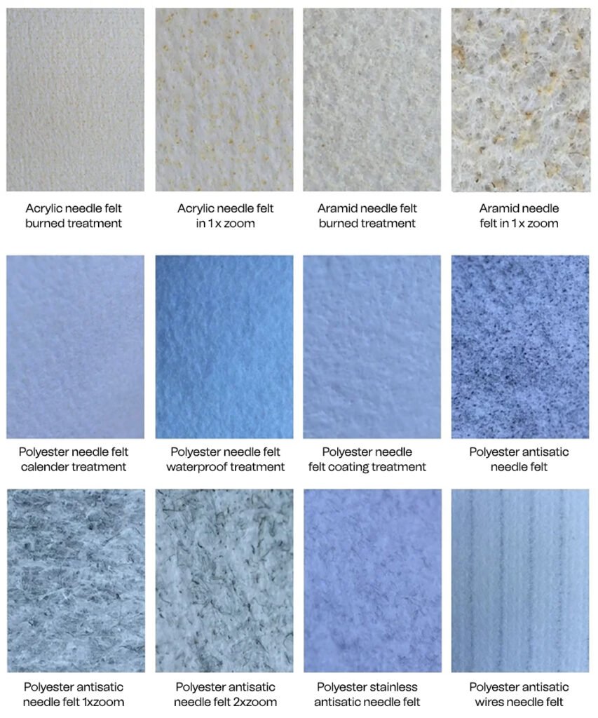 | Nomex needle felt | UP to 200 degree | Good for Acid and nomal for Alkali | Asphalt | Cement dust |