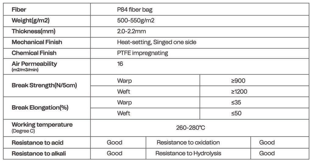 | P84 (Polyimide) Needle felt | Up to 240 degree | Good for Acid and Alkali gas | Incineration | Temperature lower than 240 degree |